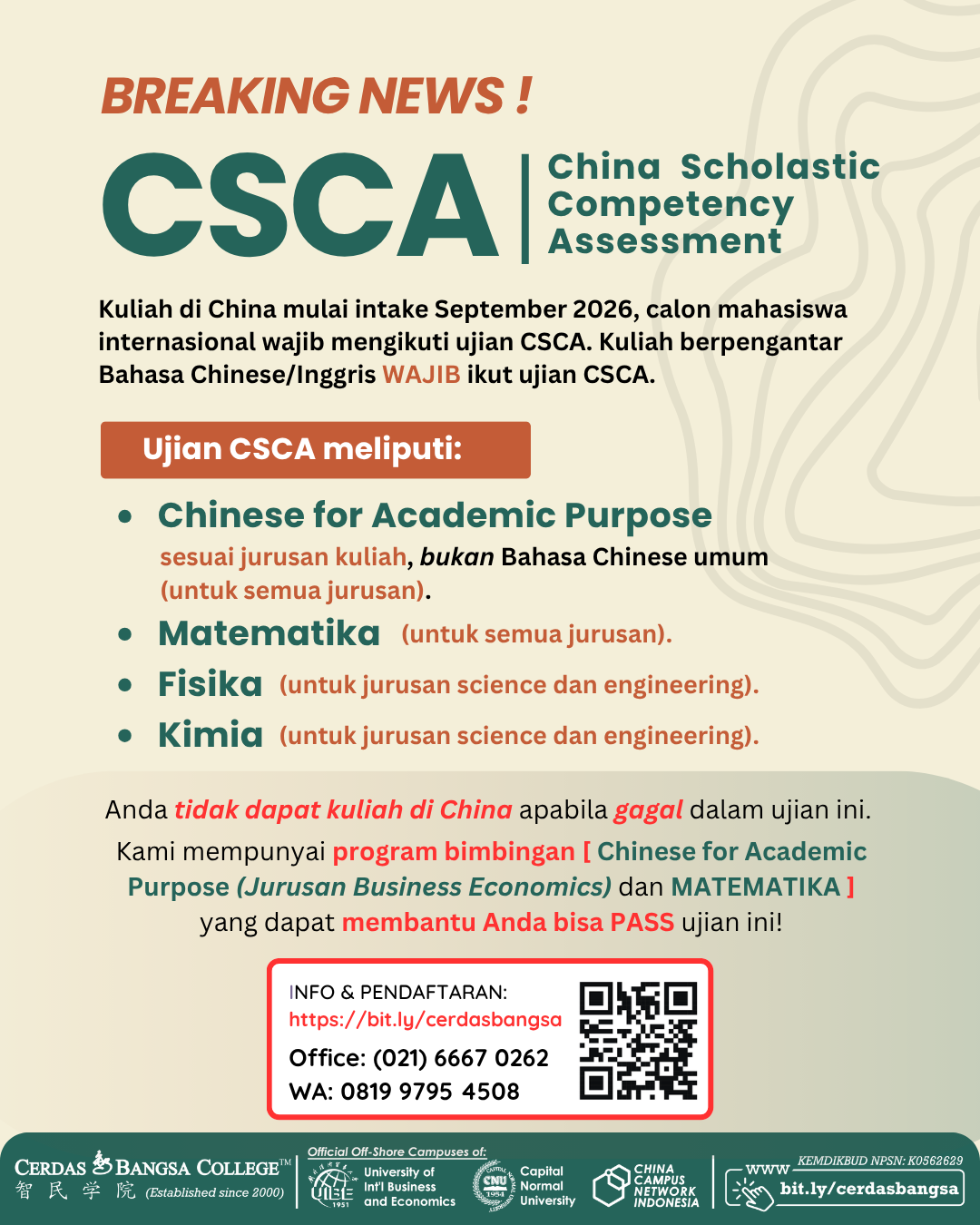BREAKING NEWS! Kuliah di China mulai intake September 2026, calon mahasiswa internasional wajib mengikuti Ujian CSCA. Kuliah berpengantar bahasa Chinese & Inggris WAJIB mengikuti ujian CSCA ini.