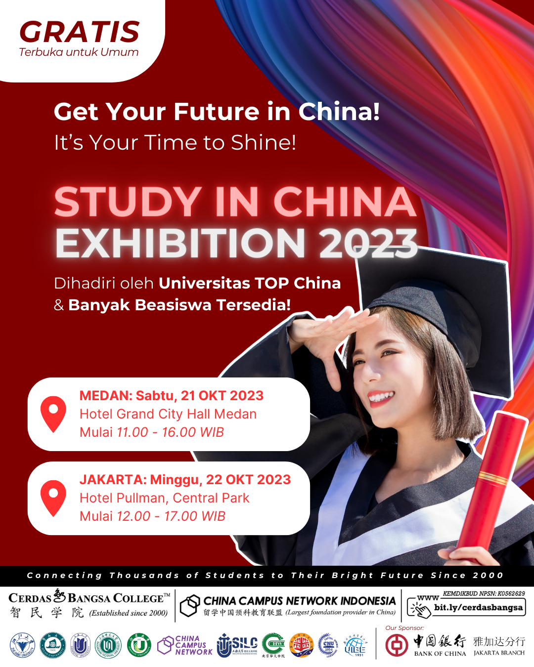 Tertarik untuk melanjutkan studi Anda di China? Jangan melewatkan pameran pendidikan Study in China Exhibition 2023 (SICE2023) yang diselenggarakan oleh Cerdas Bangsa College, akan berlangsung pada: