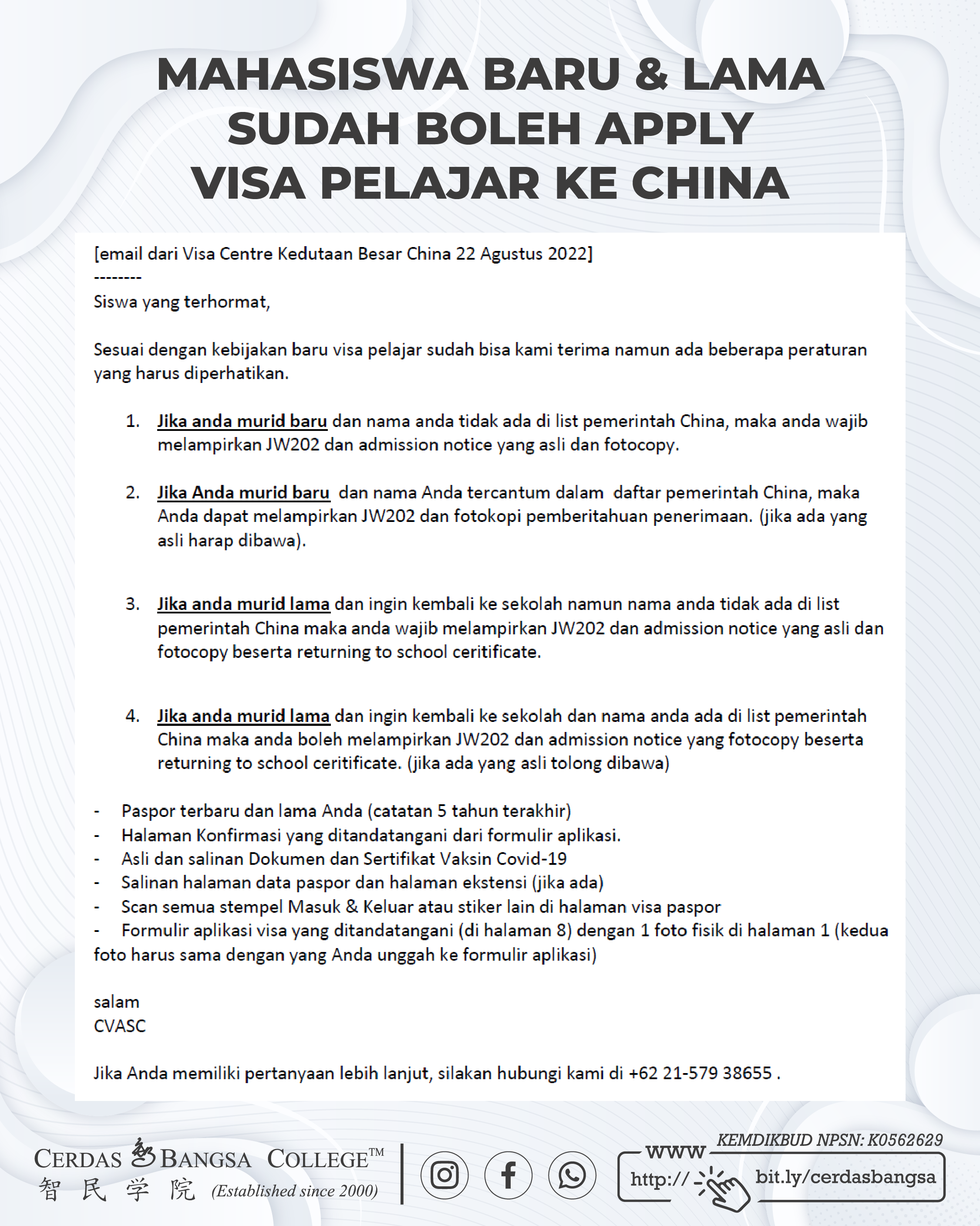 Barusan kami mendapat berita baik dari Visa Center KBRI China. Murid/mahasiswa sudah dapat mengajukan visa pelajar (lihat email terlampir di atas dari visa centre).